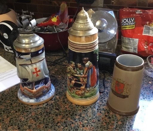 3 beer steins. One from Austria and two from Germany. Original Disney Donald Duck cartoon cell from the late 50’s. Original pen and ink Native American artist Tonpid. Oil painting from the Netherlands. Just a few of the buys.