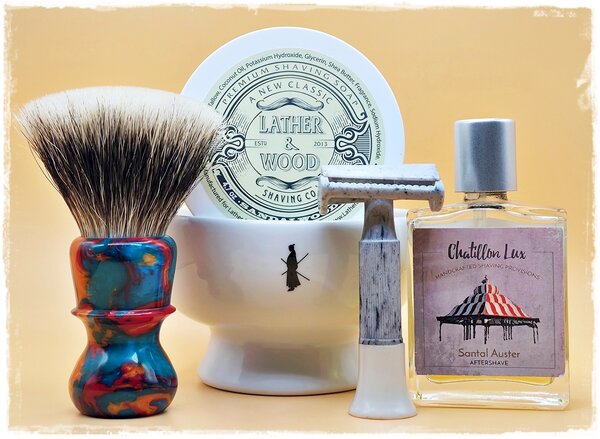 A new eclectic shave set up to start the Weekend. Another superb performance from the Ach Brito Mogno Shaving Soap Bar which I use like a shave stick rubbing it directly into my stubble then build up a lather with my wet brush adding more water to the tips of the brush continued building the lather until i get it to the consistency I prefer.