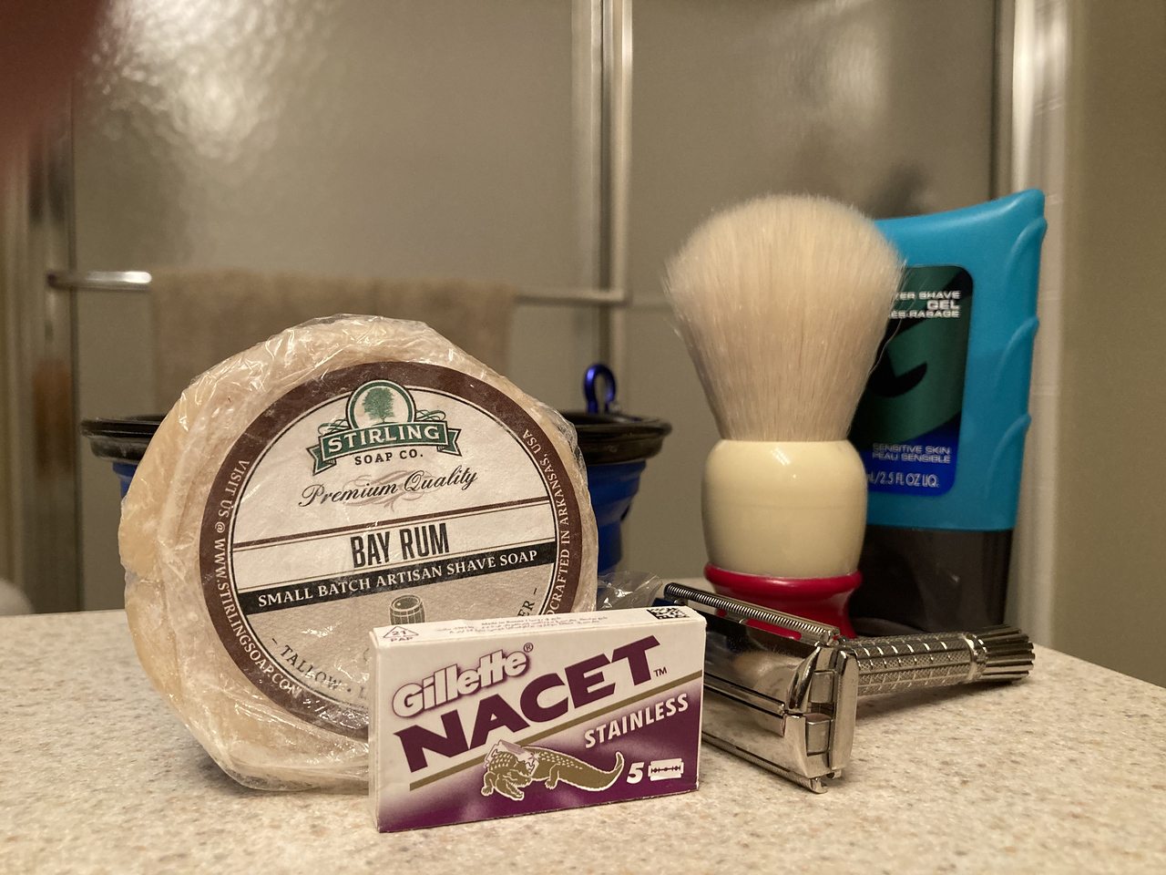Since it has been a while since I used this triple milled soap I let it bloom for an hour. (Things were delayed.) Since the boar brush has more backbone than badger I was able to dig in a bit more and really load the brush. I worked it to a proper consistency in the mug and then applied it to my face working it in against the grain to make sure all the whiskers were standing up. I did the first pass with the Treet blade and it was feeling a bit rough so I changed to a 7 am blade (first try). It was smoother but I really need to try it by itself for a more realistic appraisal. I did yhe Pre de Provence balm mostly because I have it and partly because I get some irritation from the soap on the second pass. Final finish with the Canoe aftershave. Baccarat and Seven up as aftercare. (Evening shave)