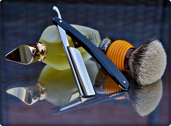 Floïd oil preshave. Nuàvia nera shaving soap & balm aftershave. soap. Yaqi Black Marble Tuxedo Synthetic Shaving Brush. F.W. Schlechtendahl & Söhne, Macero, Ohligs - Solingen, 14, carbon steel, full hollow, 7/8. Ralph Lauren Polo Black Eau de Toilette.