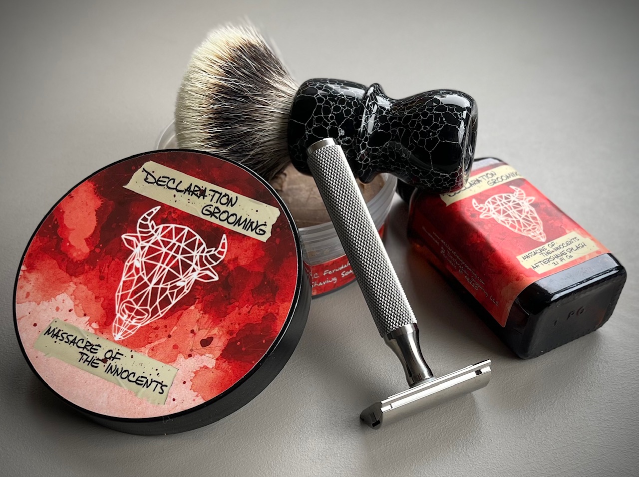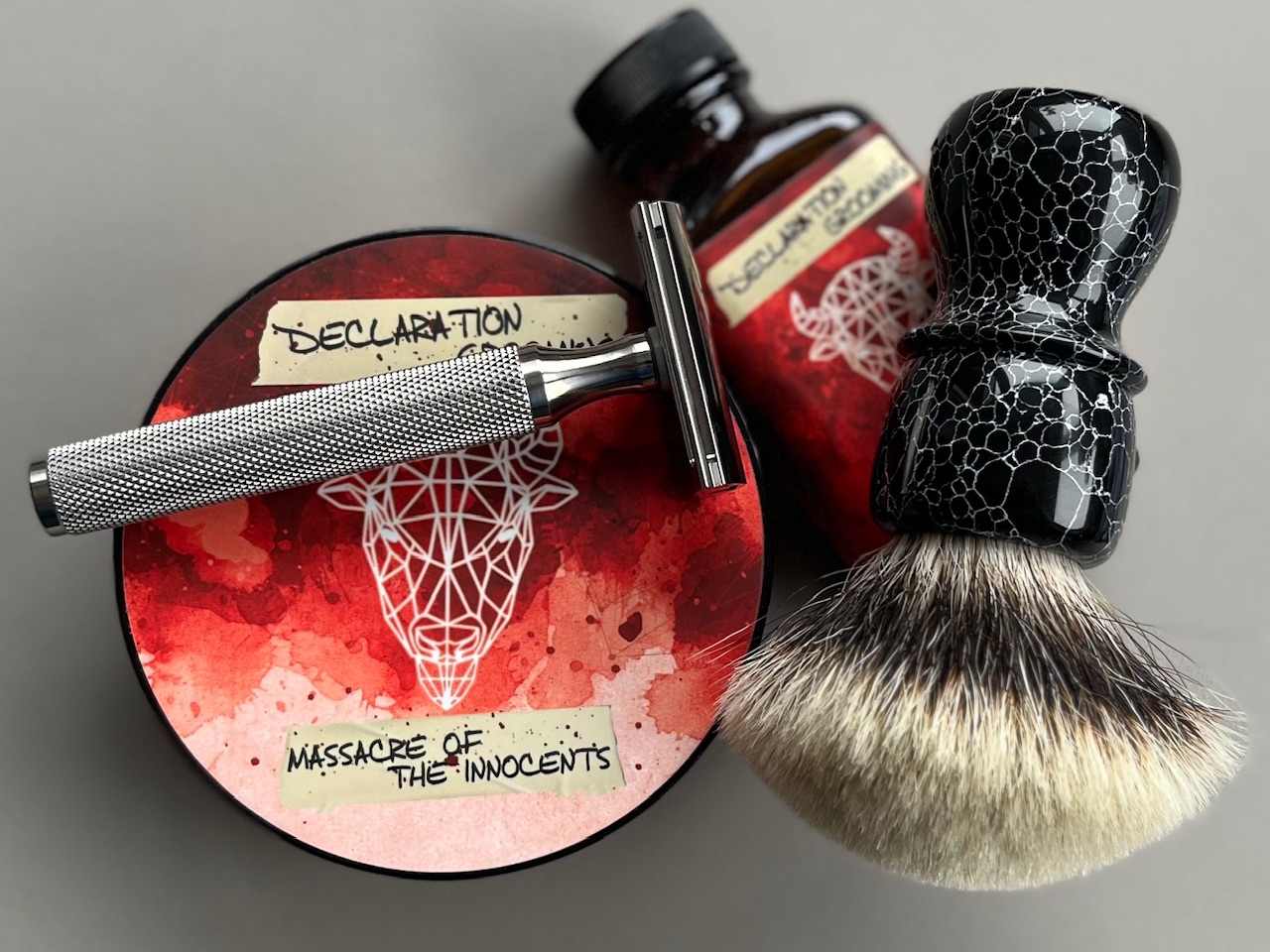 The Van der Hagen soap isn't very slick and it doesn't have a lot of cushion. I could definitely could feel every stroke. It did shave very close almost giving me a one and done shave. Second pass was as close as I'm liable to get and leave my face on. The Imperial bay rum is laural oil and cane alcohol. I've been nursing that bottle for twenty years. The Axe body spray adds a little something.