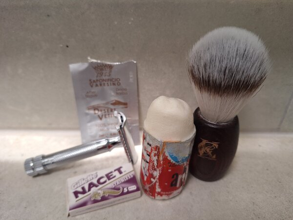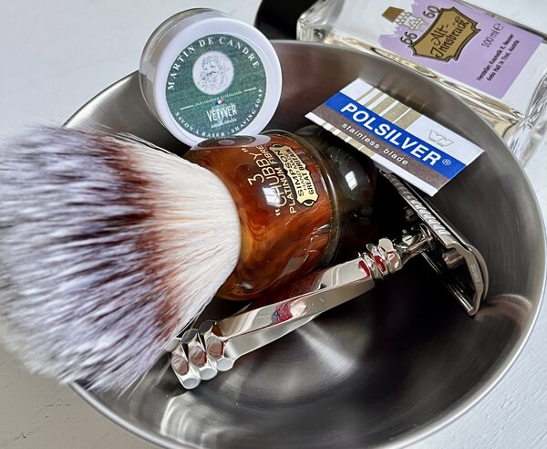 First use of the sheep’s milk soap as a pre wash, quickly produces a thick lather as a good base for the Tabac.Was in fact a very nice quick Shave with a very pleasing close finish.